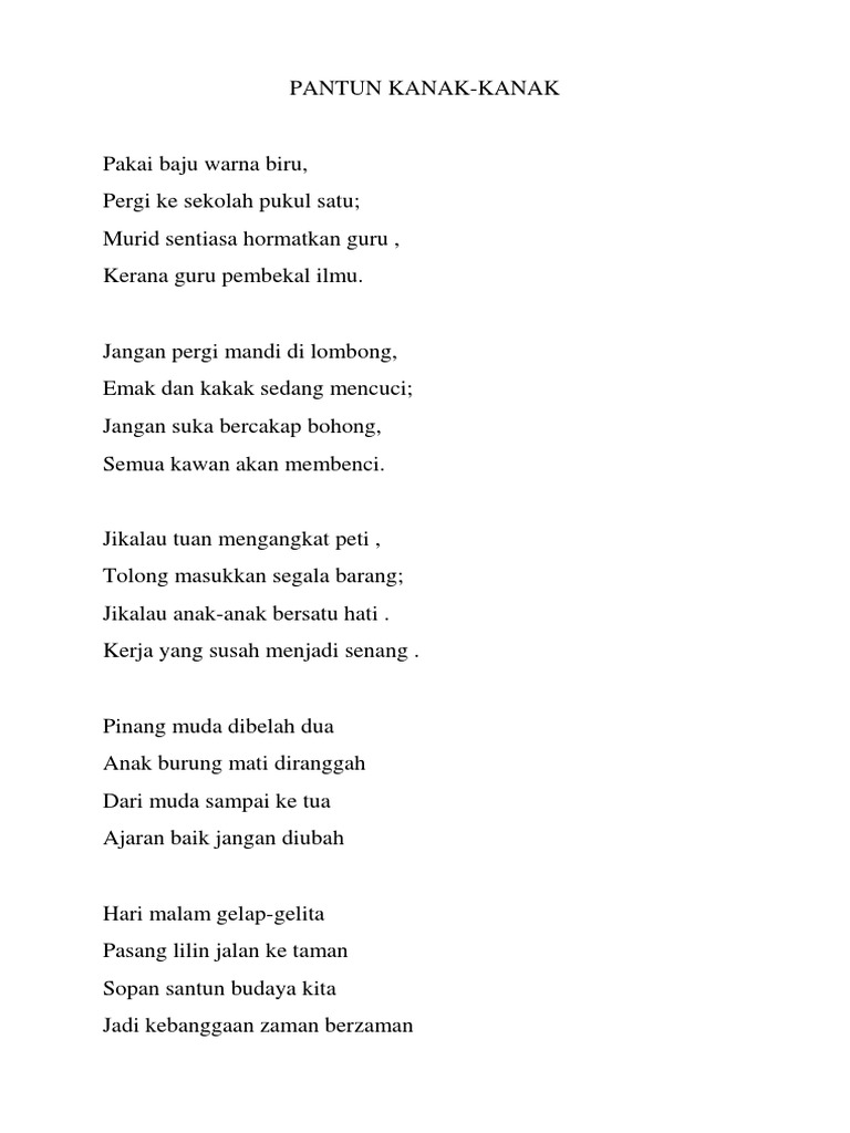 PANTUN ANAK-ANAK Selamat datang kembali di Blog SenipediaPada kesempatan kali ini saya kembali merangkum koleksi pantun dengan tema yang baru yakni kumpulan Pantun kanak-kanak untuk pembaca semua. Pergi ke pasar beli labu Pulangnya aku lewat jalan jambu Aku suka bermain dadu Pastinya menyenangkan dan seru. Jadilah anak yang rendah hati.